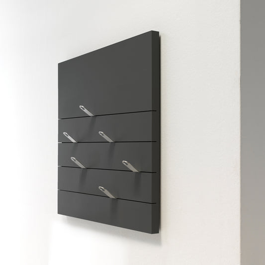 die garderobe ist ein kunstwerk an ihrer wand das ordnung hält. die haken lassen sich bequem in der höhe einschieben, in der sie diese benötigen. die garderobe basic in anthrazit ist sofort lieferbar und im preisvorteil. wählen sie aus verschiedenen formaten. hier gelangen sie zur garderobe in 21 farben, die wir für sie anfertigen.